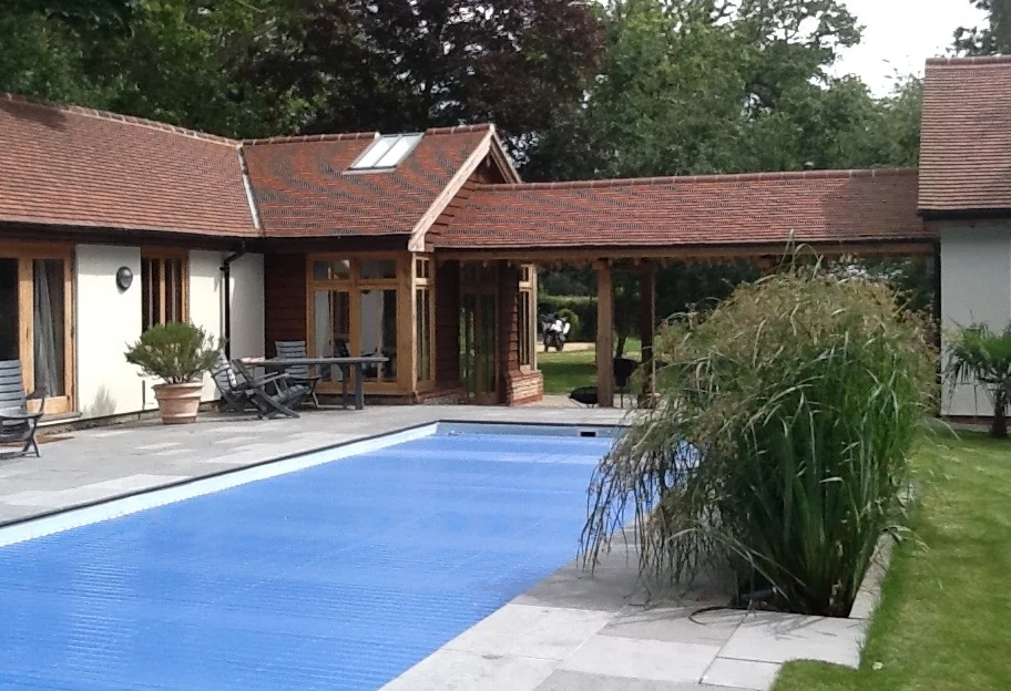 250msq Arts and Crafts house extended to 300msq, swimming pool complex and conversion of outhouses to home office and guest accommodation. Works to house involved a 20msq conventional extension and rearrangement of staircase, a 30msq green oak framed garden room, alterations to bedrooms and the design and installation of a media and entertainment room. The swimming pool complex involved designing the pool and associated buildings to work within a 1920s garden originally laid out by Gertrude Jekyll. The conversion and extension of the outbuildings was undertaken to reflect the high quality of the previous projects.